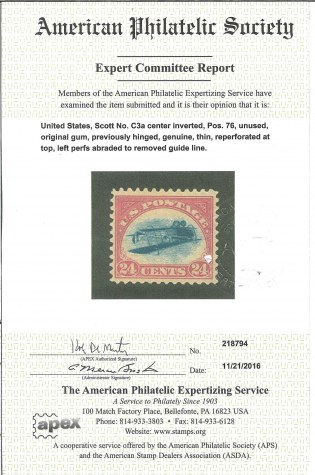 United States, Scott C3a center inverted, Pos. 76, unused, original gum, previously hinged, genuine, thin, reperforated at top, left perfs abraded to remove guide line