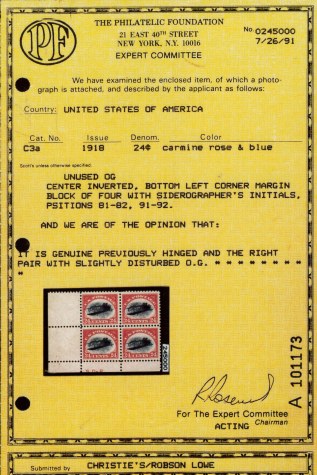 BOTTOM LEFT CORNER MARGIN BLOCK OF FOUR WITH SIDEROGRAPHER'S INITIALS, POSITIONS 81-82, 91-92., IT IS GENUINE PREVIOUSLY HINGED AND THE RIGHT PAIR WITH SLIGHTLY DISTURBED O.G.