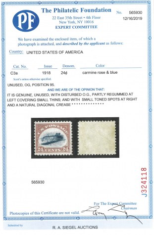 It is Genuine, Unused, with disturbed o.g., partly regummed at left covering small thins, and with small toned spots at right and a natural diagonal crease