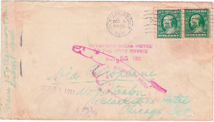 The new airplane Ovington planned to fly across country suffered severe mechanical failure, and, after several attempts, the flight was cancelled on 11 October. There is only one recorded piece of mail that was clearly marked to be carried on this aborted flight.