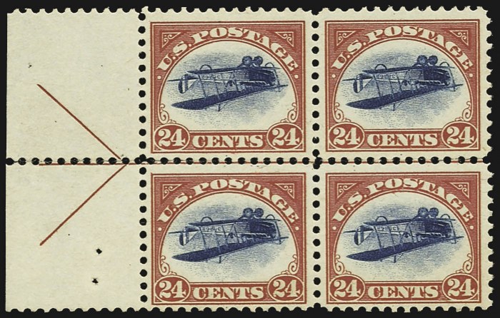 With left sheet margin and arrow. This block was one of the few position pieces retained by Colonel Edward H.R. Green from his purchase of the discovery sheet. It was likely broken into two part arrow pairs by Col. Green. It has been discreetly rejoined. It has slightly mount-disturbed original gum and a pinpoint thin spot in the top left stamp.