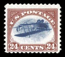 #C3a, 24c Carmine rose and blue, Center Inverted, position 22, attractively centered, deep rich colors, full o.g., relatively lightly hinged, small natural paper spot visible only on reverse, fine-very fine. The 1918 Twenty Four Cent Inverted Jenny is one of the most recognized and desired rarities in all of philately. Its legendary status began the moment the stamp was issued in May, 1918, when William T. Robey purchased an entire error sheet of 100 at the New York Avenue Post Office window in Washington D.C. - just one day after the stamp was issued - May 14th. Within one week Robey sold the sheet for $15,000.00 to the well-known Philadelphia stamp dealer Eugene Klein (an impressive return on his initial $24.00 investment). Shortly thereafter Mr. Klein sold the sheet to the renowned, yet eccentric collector, Col. Edward H.R. Green for $20,000.00. Col. Green asked Klein to break up the sheet for him into singles and blocks, then instructed him to sell all but the few key position blocks. What is puzzling is how, given the immediate attention created by a spectacular new error, so many of the stamps from the sheet have been poorly handled and stored over the years. In fact, there are at least six examples whose whereabouts are unknown and presumably lost to philately. A great many of the known copies have varying degrees of faults and some even have lost all of their original gum. Improper hinging has caused a significant number of the faults, often thinning or creasing the stamps.The example from the Wagner collection is one of the desirable completely sound, original gum examples available to collectors. Each individual example, or multiples still remaining intact, from the original error sheet has a story behind it - who has been its previous owners, why and how it was acquired. The Wagner copy has its own poignant story behind it. Back when Keith Wagner was just 20 years old in 1952, his grandmother had given him a gift of cash to buy his first automobile - a Ford Convertible. But instead of heading directly to the first used car dealer, he booked himself an airline ticket to New York City to attend the September 23, 1952 Harmer, Rooke & Co. auction - with one goal in mind, to buy the position 22 "Inverted Jenny" featured in the auction. He patiently waited for the other lots to be auctioned. When a call for bids was made on the "Jenny" he encountered considerable bidding competition from the dealers and collectors in attendance - all of whom were much older than he. As the bidding slowed, one of the dealers at the auction spoke up and publicly said "let the kid have it." And so the lot hammered down at $2,500.00 (!) and Keith A. Wagner was now the proud owner of one of the most recognizable rarities in philately. He took great pride and pleasure of ownership of the stamp for his entire adult life. Now, in 2008, his widow Barbara A. Wagner has decided to sell Keith's beloved "Jenny" in the hope that the new owner will receive just as much pride of ownership as Keith did. Accompanied by a 2008 PF certificate