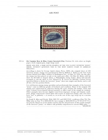 According to Jenny by George Amick (Amos Press, 1986), the original sheet of 100 Inverted "Jenny" stamps was purchased for $24 by William T. Robey at the New York Avenue Branch Post Office window in Washington D.C., on May 14, 1918, one day after the stamp was first placed on sale at the main post office. On May 20, Robey sold his sheet for $15,000 to Eugene Klein, a Philadelphia stamp dealer. Klein had already arranged to sell the sheet to Col. Edward H. R. Green for $20,000. Colonel Green instructed Klein to divide the Inverted "Jenny" sheet into singles and blocks, and to sell all but a few key position blocks.