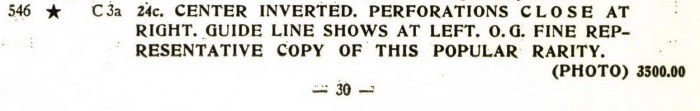 C3a 24c CENTER INVERTED. PERFORATIONS CLOSE AT RIGHT. GUIDE LINE SHOWS AT LEFT. O.G. FINE REPRESENTATIVE COPY OF THIS POPULAR RARITY.