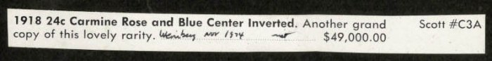 1918 24c Carmine Rose and Blue Center Inverted Another grand copy of this lovely rarity, offered at $49,000.