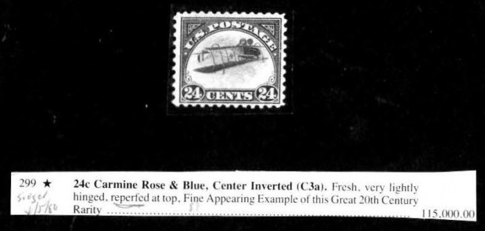 24c Carmine Rose & Blue, Center Inverted (C3a). Fresh, very lightly hinged, reperfed at top, Fine Appearing Example of this Great 20th Century Rarity