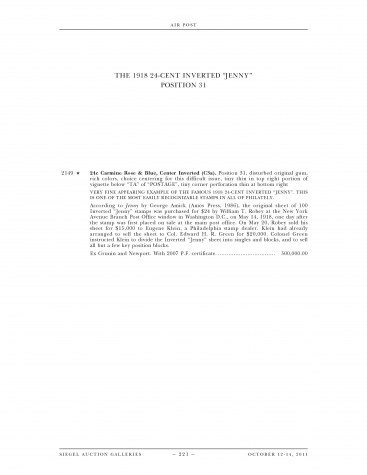 According to Jenny by George Amick (Amos Press, 1986), the original sheet of 100 Inverted "Jenny" stamps was purchased for $24 by William T. Robey at the New York Avenue Branch Post Office window in Washington D.C., on May 14, 1918, one day after the stamp was first placed on sale at the main post office. On May 20, Robey sold his sheet for $15,000 to Eugene Klein, a Philadelphia stamp dealer. Klein had already arranged to sell the sheet to Col. Edward H. R. Green for $20,000. Colonel Green instructed Klein to divide the Inverted "Jenny" sheet into singles and blocks, and to sell all but a few key position blocks.