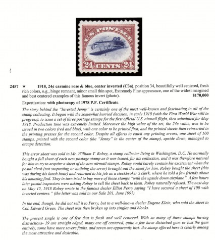 This error sheet was sold to Mr. William T. Robey, a stamp collector living in Washington, D.C. He normally bought a full sheet of each new postage stamp as it was issued, for his collection, and it was therefore natural for him to try to acquire a sheet of the new airmail stamps. Robey could barely contain his excitement when the postal clerk (not suspecting or noticing the error) brought out the sheet for him. Robey bought the sheet (this was during his lunch hour) and returned to his job as a stockbroker�s clerk, where he told a few friends about his amazing find. They in turn tried to buy more of those stamps "with the upside down airplane". A few hours later postal inspectors were asking Robey to sell the sheet back to them. Robey naturally refused. The next day on May 15, 1918 Robey wrote to the famous dealer Elliot Perry saying "I have secured a sheet of 100 with inverted centers." (the letter was sold in our Sale 201, June 1997).