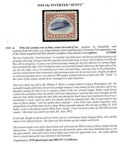 This error sheet was sold to Mr. William T. Robey, a stamp collector living in Washington, D.C. He normally bought a full sheet of each new postage stamp as it was issued, for his collection, and it was therefore natural for him to try to acquire a sheet of the new airmail stamps. Robey could barely contain his excitement when the postal clerk (not suspecting or noticing the error) brought out the sheet for him. Robey bought the sheet (this was during his lunch hour) and returned to his job as a stockbroker's clerk, where he told a few friends about his amazing find. They in turn tried to buy more of those stamps "with the upside down airplane". A few hours later postal inspectors were asking Robey to sell the sheet back to them. Robey naturally refused. The next day on May 15, 1918 Robey wrote to the famous dealer Elliot Perry saying "I have secured a sheet of 100 with inverted centers". (the letter was sold in our Sale 201, June 1997)