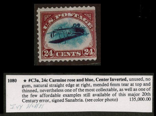 #C3a, 24c Carmine rose and blue, Center Inverted, unused, no gum, natural straight edge at right, mended 6mm tear at top and thinned, nevertheless one of the most collectable, as well as one of the few affordable examples still available of this major 20th Century error, signed Sanabria