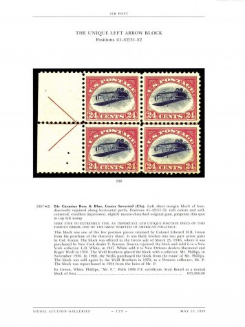 This block was one of the few position pieces retained by Colonel Edward H.R. Green from his purchase of the discovery sheet. It was likely broken into two part arrow pairs by Col. Green. The block was offered in the Green sale of March 25, 1946, where it was purchased by New York dealer Y. Souren. Souren rejoined the block and sold it to a New York collector, L.D. White, in 1947. White sold it to New Orleans dealers Raymond and Roger Weill in 1950. The Weill Brothers placed the block with a collector, Mr. Phillips, in November 1950. In 1968, the Weills purchased the block from the estate of Mr. Phillips. The block was sold again by the Weill Brothers in 1970, to a Western collector, Mr. P. The block was repurchased in 1984 from the heirs of Mr. P.