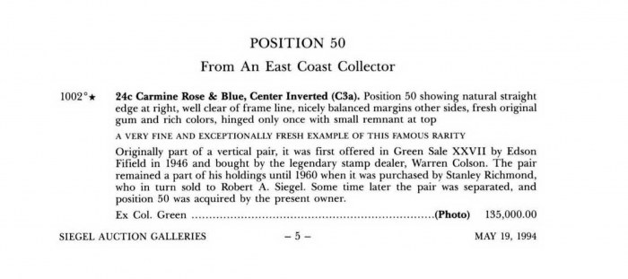 Originally part of a vertical pair, it was first offered in Green Sale XXVII by Edson Fifield in 1946 and bought by the legendary stamp dealer, Warren Colson. The pair remained a part of his holdings until 1960 when it was purchased by Stanley Richmond, who in turn sold to Robert A. Siegel. Some time later the pair was separated, and position 50 was acquired by the present owner.