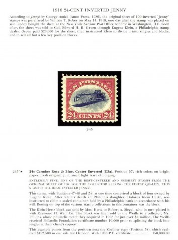 This stamp, with Positions 47-48 and 58, at one time comprised a block of four owned by Eugene Klein. After Klein's death in 1944, his daughter, Dolores Klein Hertz, was instructed to claim a sealed container held by a Philadelphia bank in accordance with his Will. Resting on top of the various stamp collections in this container was the block of inverts.
