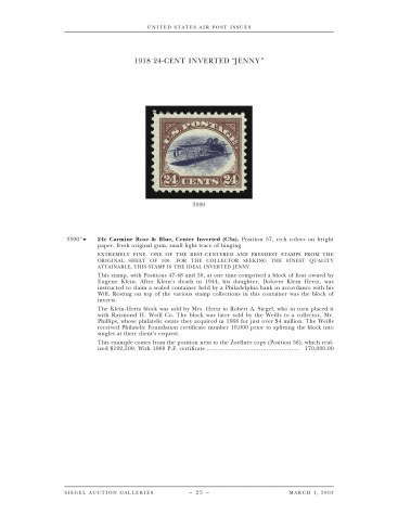 This example comes from the position next to the Zoellner copy (Position 58), which realized $192,500. With 1988 P.F. certificate