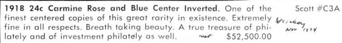1918 24c Carmine Rose & Blue Center Inverted. One of the finest centered copies of this great rarity in existence. Extremely fine in all respects. Breath taking beauty. A true treasure of philately and of investment philately as well.