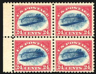 There are five recorded intact blocks of four of the Inverted Jenny error: 1) plate number block, 2), corner margin block with initials, 3) centerline block, 4) horizontal line block, and 5) the "Princeton Block" offered here. The "Princeton Block" was owned by Edgar Palmer and donated by his widow to Princeton University in 1947. The block was subsequently sold on behalf of Princeton in 1976, where it was purchased by the Weills of New Orleans for $170,000. The Weill Brothers then sold the block in 1979 for $500,000 to a syndicate from Florida. The block was again auctioned in 1982, where it sold to Kenneth Wenger.