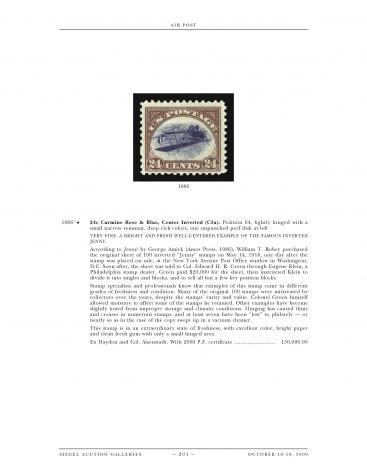 According to Jenny! by George Amick (Amos Press, 1986), William T. Robey purchased the original sheet of 100 inverted "Jenny" stamps on May 14, 1918, one day after the stamp was placed on sale, at the New York Avenue Post Office window in Washington, D.C. Soon after, the sheet was sold to Col. Edward H. R. Green through Eugene Klein, a Philadelphia stamp dealer. Green paid $20,000 for the sheet, then instructed Klein to divide it into singles and blocks, and to sell all but a few key position blocks.