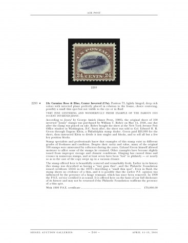 According to Jenny! by George Amick (Amos Press, 1986), the original sheet of 100 inverted "Jenny" stamps was purchased by William T. Robey on May 14, 1918, one day after the stamp was placed on sale. Robey bought the sheet at the New York Avenue Post Office window in Washington, D.C. Soon after, the sheet was sold to Col. Edward H. R. Green through Eugene Klein, a Philadelphia stamp dealer. Green paid $20,000 for the sheet, then instructed Klein to divide it into singles and blocks, and to sell all but a few key position blocks.