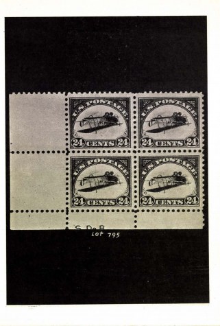 24c carmine rose & blue inverted center, (C3A) Wonderfully fine block of four o.g. from lower left corner with full sheet margins. This is stated to be the finest centered block in the only known sheet of this very rare and interesting error