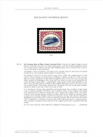 According to Jenny! by George Amick (Amos Press, 1986), the original sheet of 100 "Jenny" Invert stamps was purchased by William T. Robey on May 14, 1918, one day after the stamp was placed on sale. Robey bought the sheet at the New York Avenue Post Office window in Washington, D.C. Soon after, the sheet was sold to Col. Edward H. R. Green through Eugene Klein, a Philadelphia stamp dealer. Green paid $20,000 for the sheet, then instructed Klein to divide it into singles and blocks, and to sell all but a few key position blocks. This stamp, Position 86, was joined with the bottom plate number and arrow block at the time of the Green sale in 1944.