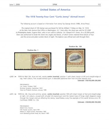 1918 Air Mail 24c. blue and red, variety centre inverted, position 1 with sheet margin at left and straight-edge at