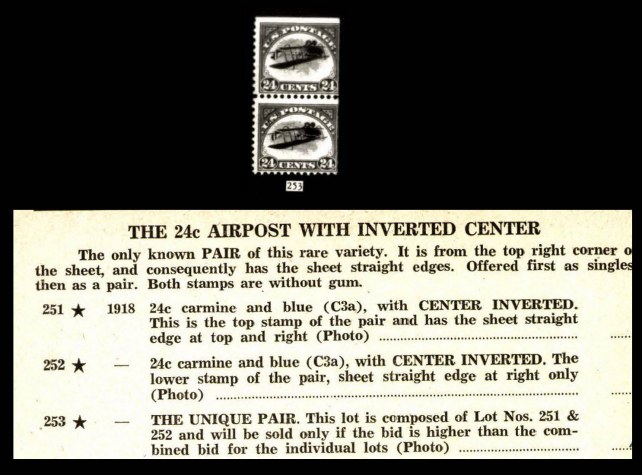 251 * 1918 24c carmine and blue (C3a), with CENTER INVERTED. This is the top stamp of the pair and has the sheet straight edge at top and right (Photo)