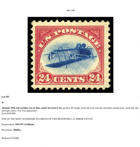 Airmail, 1918, 24ยข carmine rose & blue, center inverted (C3a), position 89, bright, fresh and well centered, disturbed original gum, small thin spot and light crease, Very Fine appearance.