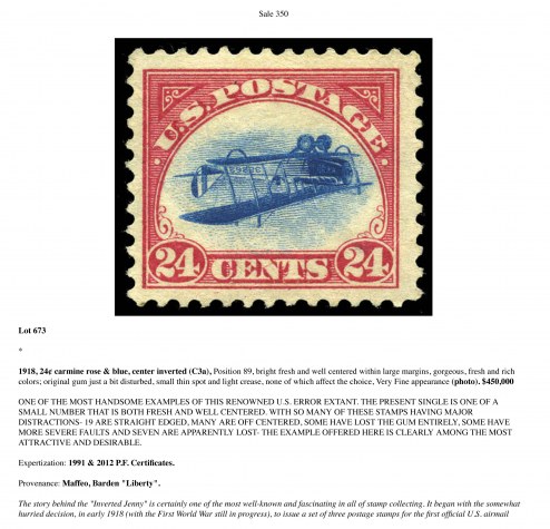 ONE OF THE MOST HANDSOME EXAMPLES OF THIS RENOWNED U.S. ERROR EXTANT. THE PRESENT SINGLE IS ONE OF A SMALL NUMBER THAT IS BOTH FRESH AND WELL CENTERED. WITH SO MANY OF THESE STAMPS HAVING MAJOR DISTRACTIONS- 19 ARE STRAIGHT EDGED, MANY ARE OFF CENTERED, SOME HAVE LOST THE GUM ENTIRELY, SOME HAVE MORE SEVERE FAULTS AND SEVEN ARE APPARENTLY LOST- THE EXAMPLE OFFERED HERE IS CLEARLY AMONG THE MOST ATTRACTIVE AND DESIRABLE.
