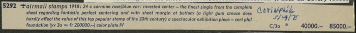 airmail stamps 1918: 24c carmine rose/blue var: inverted center -- the finest singe from the complete sheet regarding fantastic perfect centering and with sheet margin at bottom (a light gum crease does hardly affect the value of this top popular stamp of the 20th century) a spectacular exhibition piece -- cert. phil. foundation