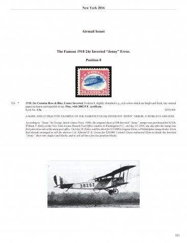 According to "Jenny" by George Amick (Amos Press, 1986), the original sheet of 100 Inverted "Jenny" stamps was purchased for $24 by William T. Robey at the New York Avenue Branch Post Office window in Washington D.C., on May 14, 1918, one day after the stamp was first placed on sale at the main post office. On May 20, Robey sold his sheet for $15,000 to Eugene Klein, a Philadelphia stamp dealer. Klein had already arranged to sell the sheet to Col. Edward H. R. Green for $20,000. Colonel Green instructed Klein to divide the Inverted "Jenny" sheet into singles and blocks, and to sell all but a few key position blocks.