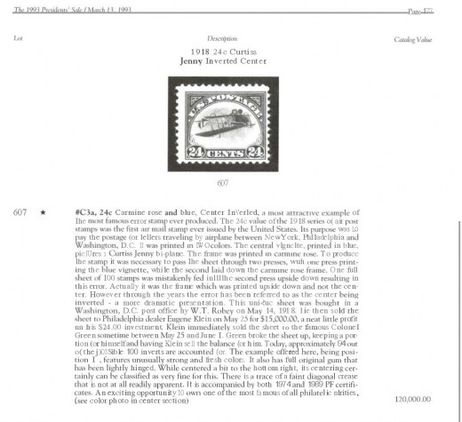 Washington, D.C. post office by W.T. Robey on May 14, 1918. He then sold the sheet to Philadelphia dealer Eugene Klein on May 25 for $15,000.00, a neat little profit on his $24.00 investment. Klein immediately sold the sheet to the famous Colonel
